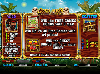 Суровый одноглазый пират встретит гэмблеров, посетивших игровой клуб Вулкан, на песчаном берегу. Он станет вашим проводником и поможет сыграть в азартные игры успешно, ведь именно эту иконку слот-машина наделила функциями Дикого символа. Кроме значения, которое способно заменять иконки в комбинации, завершая ее, игровой аппарат Gold Ahoy имеет: