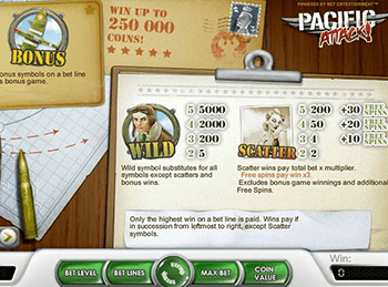 Игровой автомат Pacific Attack в считанные секунды перенесет гемблеров в годы Второй мировой войны, чтобы сделать каждого игрока участником воздушного боя. Усевшись за штурвал боевого самолета, любители азартных игр смогут нанести меткие удары по военным кораблям противника с воздуха и стать победителями виртуального сражения.