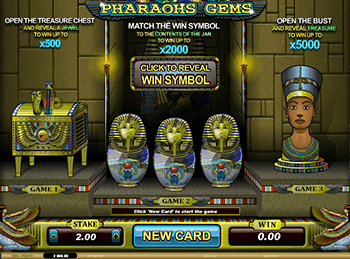 Pharaohs Gems – это лотерея со скретч-картами, где вы можете получить моментальный выигрыш до $50 000. Игровой процесс выглядит очень необычно, но тем не менее проходит по стандартному сюжету. Перед вами – всего три игры, в каждой из которых можно заработать солидный приз. Лотерейный билет приобретается вначале раунда за сумму от 0,5 до 10 долларов. Все выплаты распределяются случайным образом после покупки карточки (алгоритм ГСЧ). В игре нет бонусных опций, специальных знаков, рисковых туров и прочих дополнительных функций.