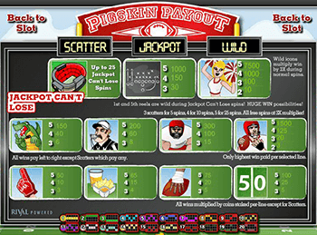 Игровой автомат Pigskin Payout научит правилам игры, знание которых приведет к спортивным и азартным победам. Вайлдом игры стала картинка с изображением девушки из группы поддержки. Он заменит недостающий символ и в таком случае увеличит выплату дважды, если удалось создать новую комбинацию. Скаттер, он же стадион, запускает до 25 фриспинов с тройными выигрышами.